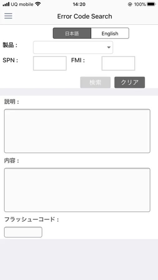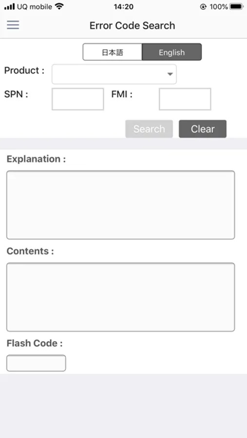 By specifying "Product", "SPN" and "FMI" and pressing the Search button, you can check the error status of the machine and "Flash Code".