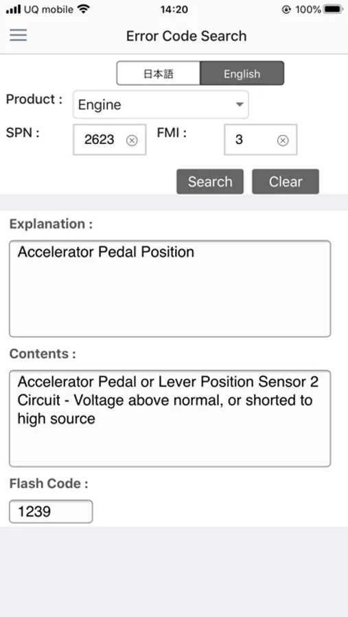 This is an application to search the current status from the status codes "SPN" and "FMI" output from the machine.