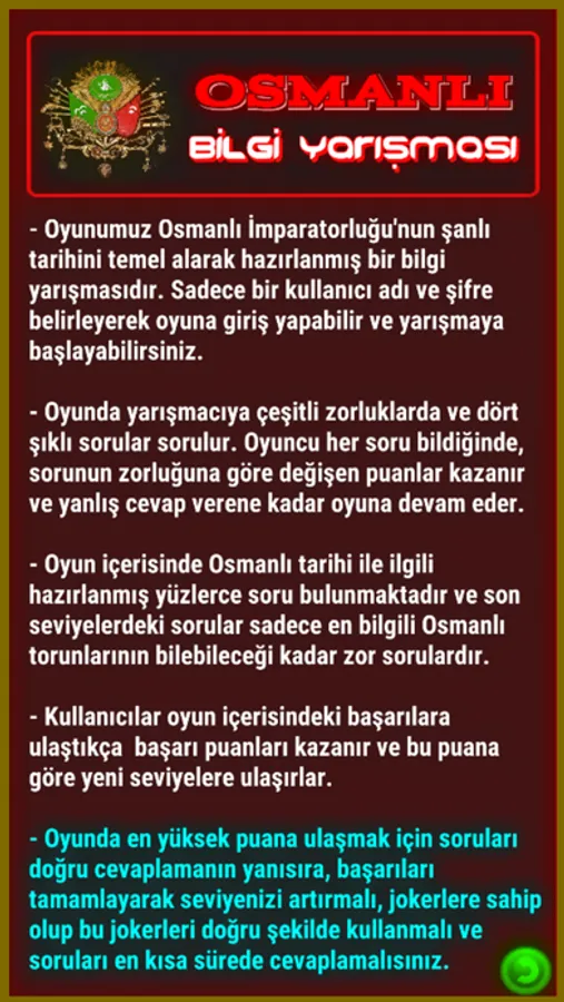 Şanlı Osmanlı İmparatorluğu tarihi hakkında bugüne kadar hazırlanmış en kaliteli bilgi yarışması oyunu sizlerle.
