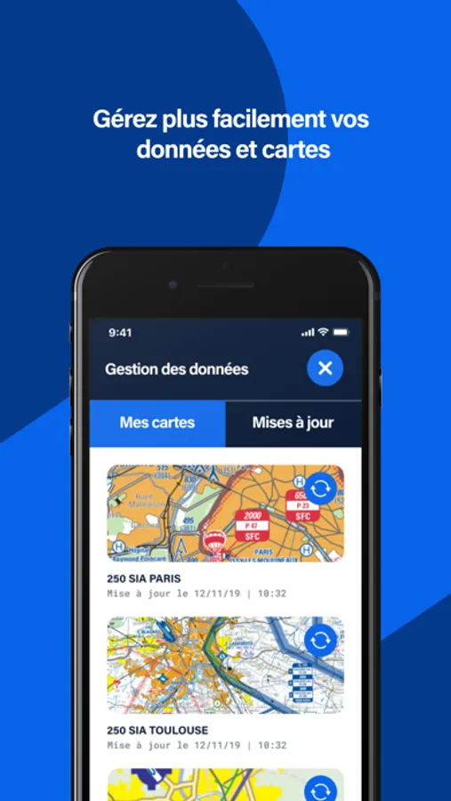 - A jour en permanence, via nos serveurs qui suivent le cycle AIRAC