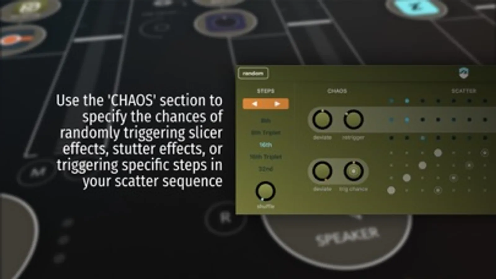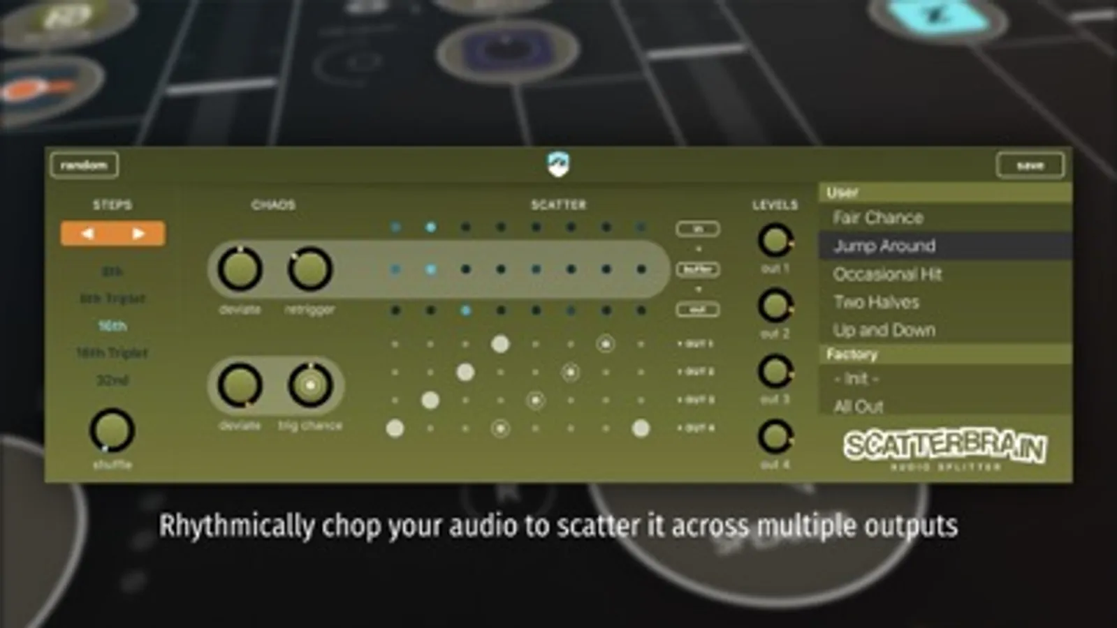 Scatterbrain records the incoming audio onto a hidden internal tapeloop. Using the buffer effects you can specify the probability of randomly triggering slicer or stutter effects for an extra seasoning of chaos and mayhem.