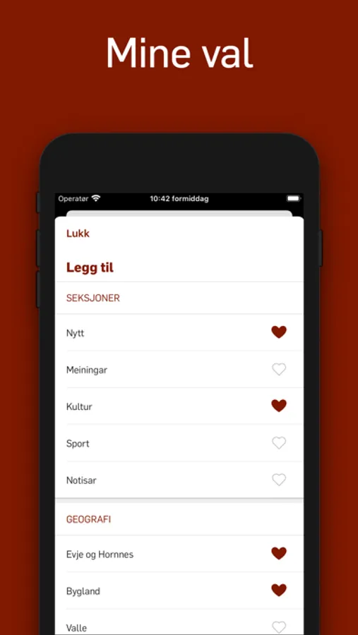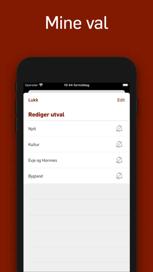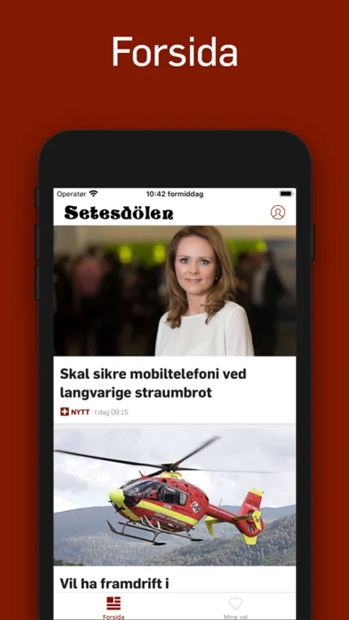 I den nye appen vår kan du vera din eigen nyheitssjef. Vel sjølv kva kategoriar, emne og stader du ønskjer nyheiter frå og vil bli varsla om. Du kan òg følgja din favorittjournalist. Hald deg oppdatert om det du sjølv synest er viktig i våre artiklar, bilete og videoar.