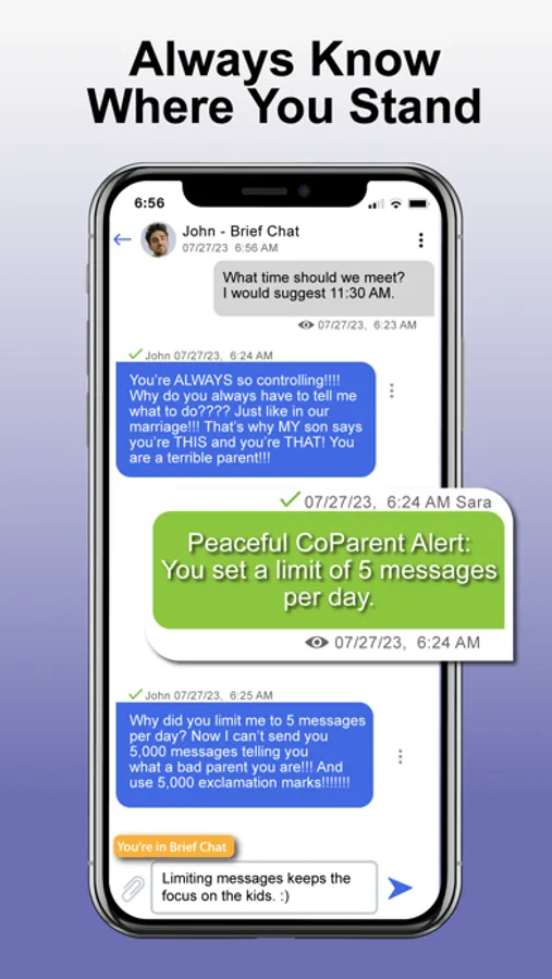 Sometimes it's hard to know how to respond to messages from your co-parent. That's why we give users Resources and Tips right inside the app every day that teach co-parents about healthy communication. Whether issues include child custody, navigating separation and divorce, parenting plans, or litigation and court appearances, Peaceful CoParenting Messenger can help.