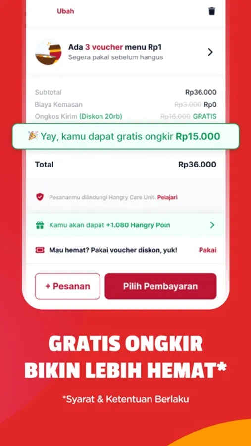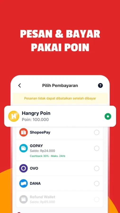 Sudah bukan jamannya bayar pakai recehan. Kami menyediakan opsi pembayaran super simpel dengan GOPAY, OVO, DANA, ShopeePay, dan Hangry Poin. Iya, poin kamu bisa dipakai buat bayar lagi kok!
