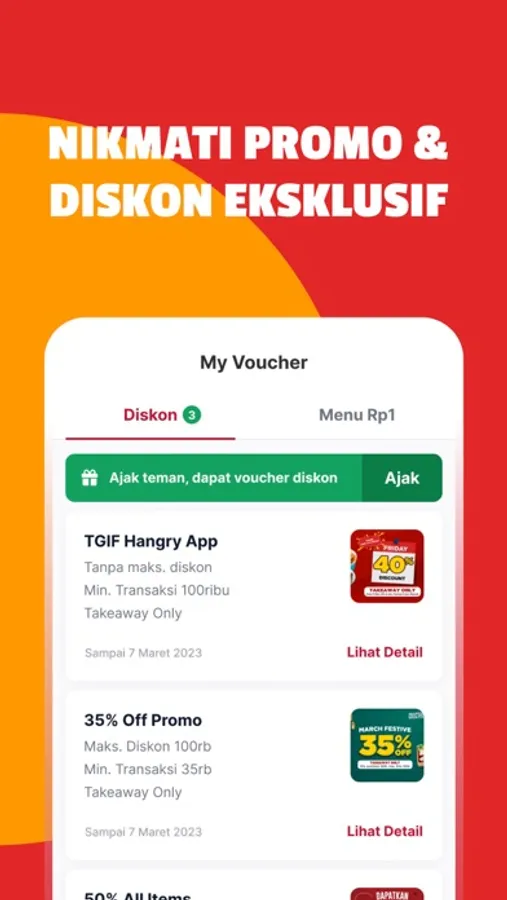 Dapatkan voucher cashback 50% dengan mengajak temanmu bergabung lalu bertransaksi menggunakan Hangry App untuk pertama kalinya.
