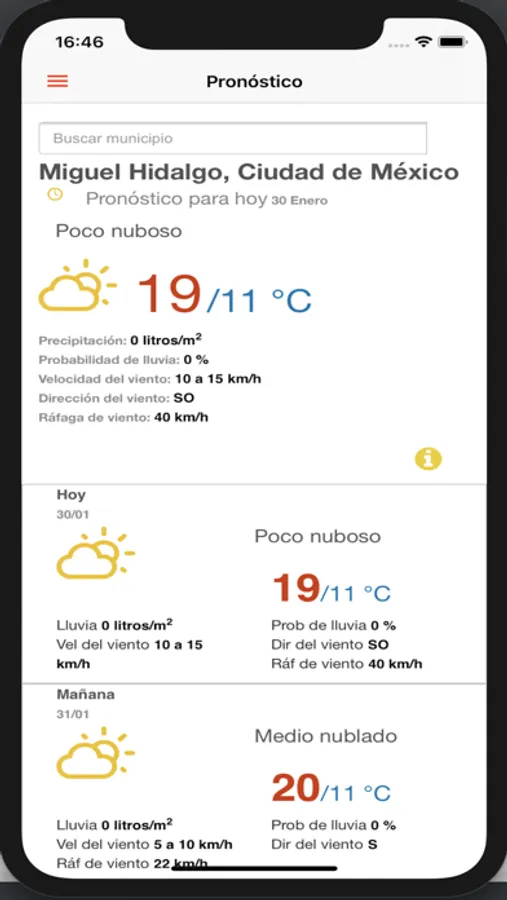 La App proporciona el pronóstico meteorológico por municipio para México de forma diaria y horaria con horizonte de pronóstico a cuatro días, este producto se basa en las salidas del modelo de pronóstico global FV3-GFS.