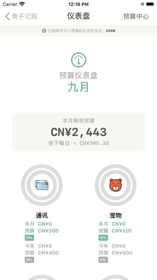 -- 预算管理:设置每个记账分类项目每月、每年的预算,并智能规划每日花费。