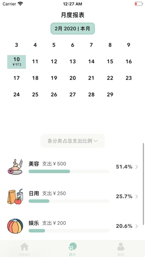 -- 账单日历:每日花费和支出均以日历的形式展现,一目了然。