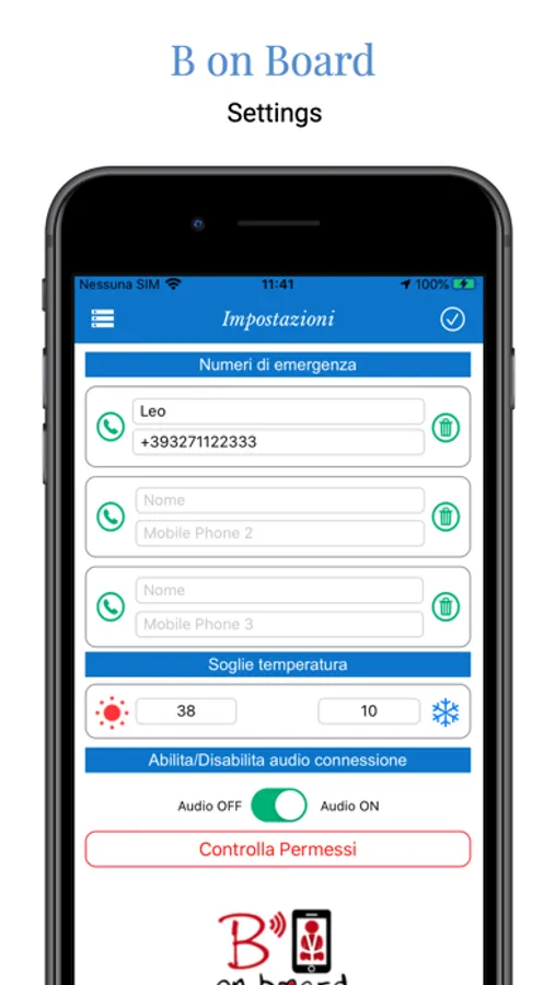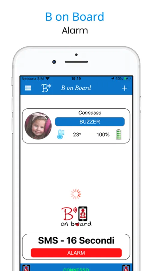 If the child stands up from the pad for more than 5 seconds, a voice message is heard "DISCONNECTED", and the device is turned off in the absence of the child. The B on Board settings have an option to deactivate the voice message related to this function: just press Audio ON or Audio OFF. If the parent leaves the car and the child remains in the car in his/her safety seat, the application warns the parent through a voice alarm "WARNING, BABY ON BOARD" when the connection with the mobile phone is lost. If this first alarm level is not deactivated by the parent, a second alarm is activated, which consists of sending text messages to a maximum number of three telephone numbers memorized by the application. The text message indicates the type of alarm and the geographical coordinates of the location of the car; the text messages are included in the price of the product and require data traffic (i.e. an Internet connection). When the temperature inside the car reaches a minimum or maximum threshold, this activates a voice alarm "HIGH TEMPERATURE" or "LOW TEMPERATURE". If this first alarm level is not deactivated by the parent, a second alarm is activated, which consists of sending a text message indicating the high or low temperature and the geographical coordinates of the location of the car. This function protects the parent when the telephone is left in the car. When the battery level reaches a preset value, a voice alarm sounds "LOW BATTERY", and the battery needs recharging as soon as possible through the micro USB port of the device using a regular charger or a power bank.