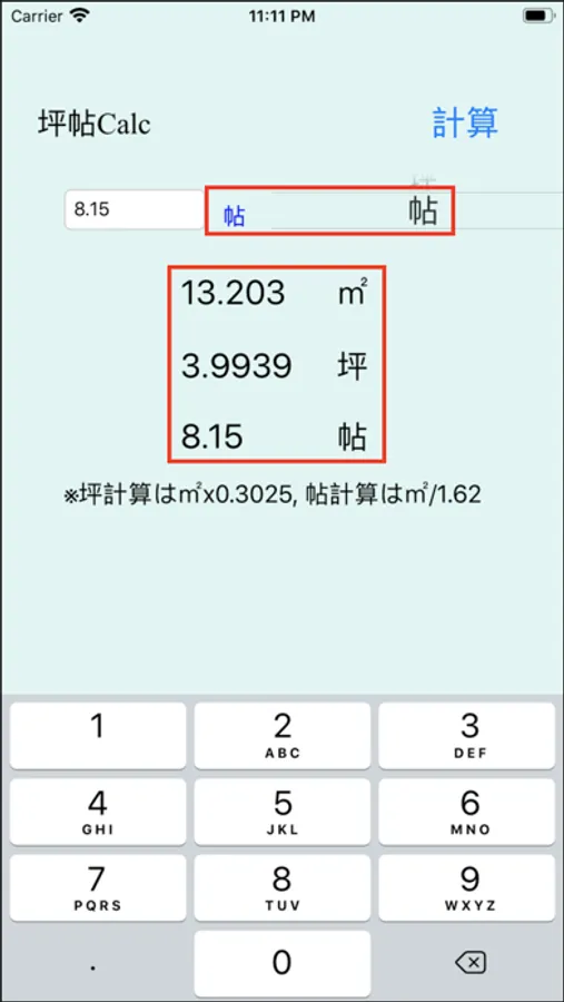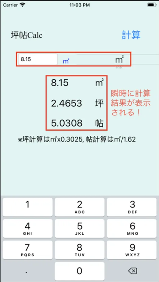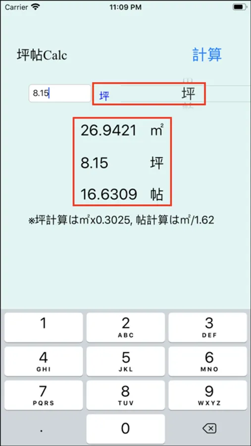 『平方メートル』と『坪』、『平方メートル』と『帖』、『坪』と『帖』が瞬時に計算されます。