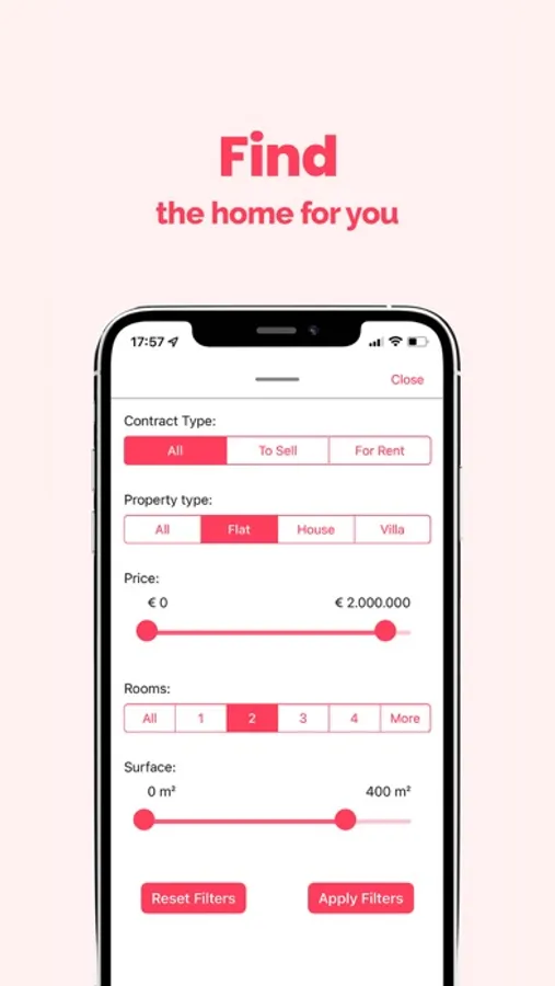 - Map based search: No more ads or pop-ups while searching a home. Insert place or point location to have your property search