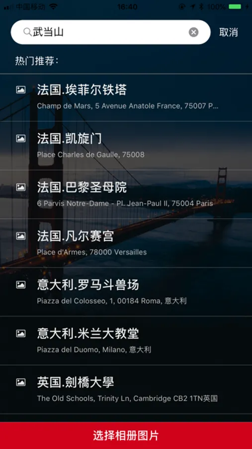 4.旅游地图图片服务-可以输入您的景区进行搜索景区热点图片直接作为您的当前旅行景区素材(补齐现场拍摄图片不理想问题).同时支持调用地图精准修改图片位置让图片位置更准确.同时您也可以选择本地拍摄的图片进行选择地图精准修改图片位置让图片位置更准确.