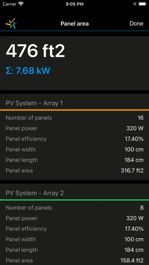 - Total area of all panels