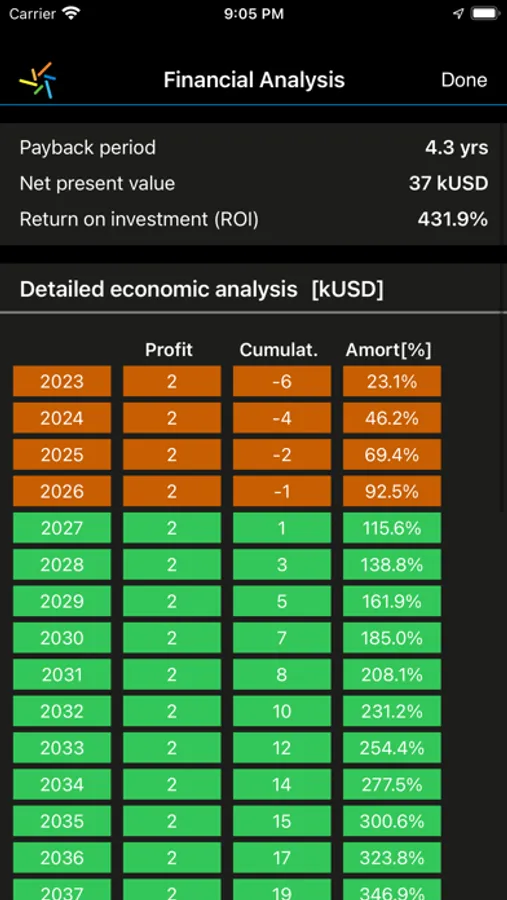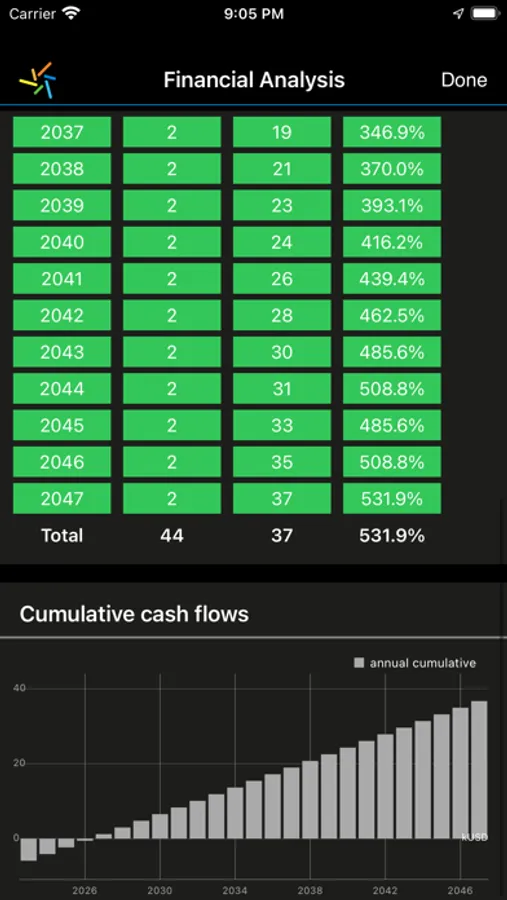 - Detailed financial analysis with cumulative cashflows for the solar PV plant lifetime
