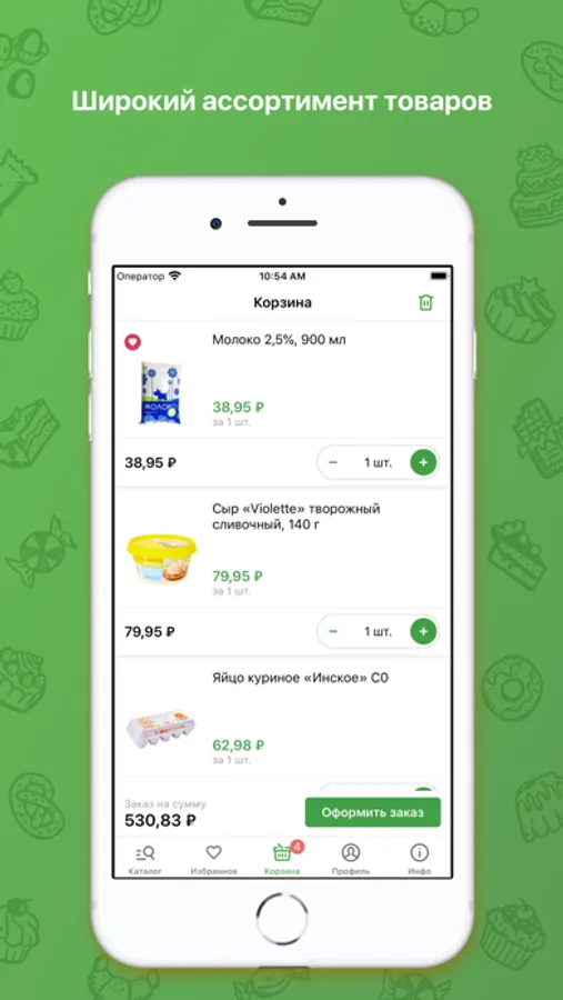 Широкий ассортимент: от курицы до мороженого, от фруктов до готовой выпечки, от напитков до зубной пасты.