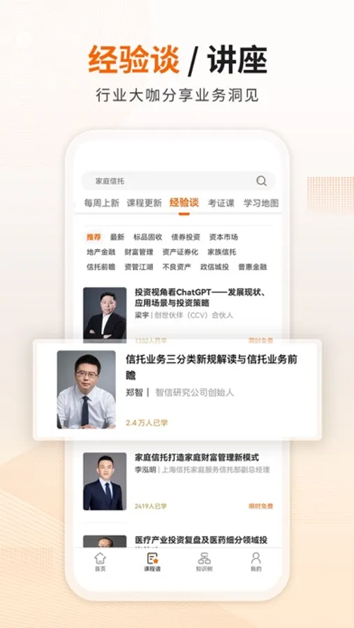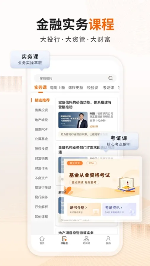 资管云课程覆盖金融市场、投资银行、资产管理、财富管理知识树体系,并推出业务前瞻大咖经验谈,一站式金融证书备考,金融法规与研究文章等综合知识服务,是为金融从业者量身打造的高效学习平台,被誉为金融行业的“知识字典”。