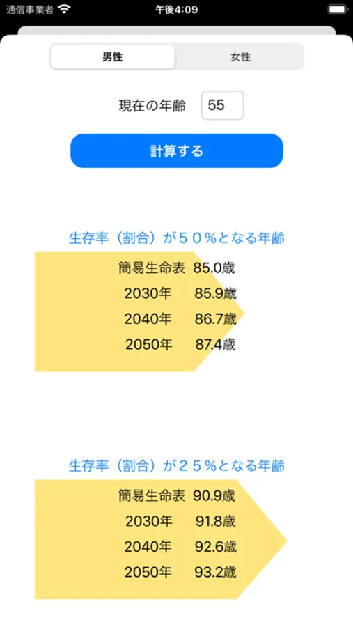 将来の生命表として国立社会保障・人口問題研究所が公表している生命表を使用して、2030年、2040年、2050年において、生存率が50%と25%になる年齢を計算しています。