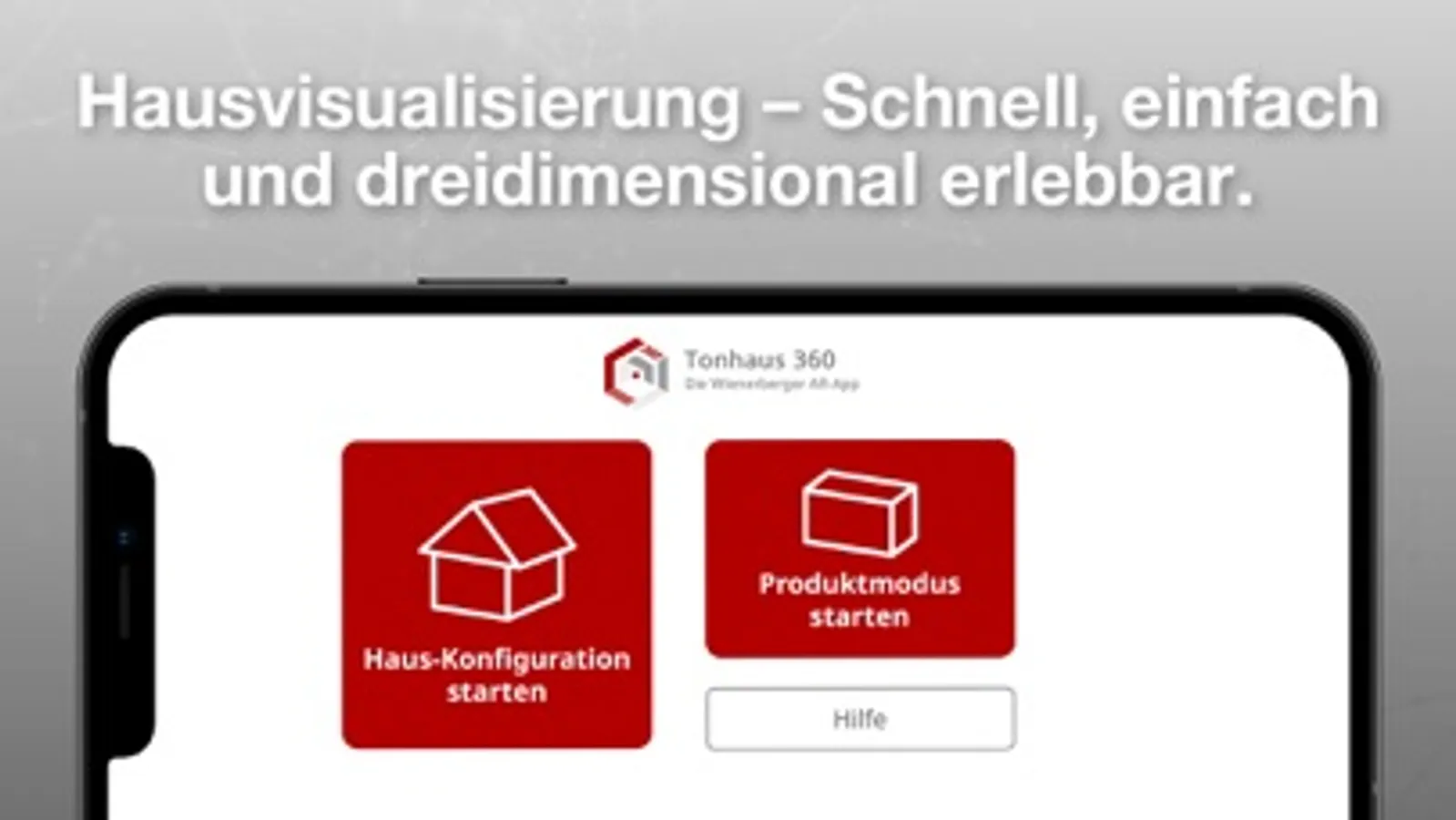 Mit Hilfe von Augmented Reality macht die Tonhaus 360 AR-App von Wienerberger die Hausvisualisierung sowie die Baustoffauswahl jetzt noch schneller und einfacher. Wählen Sie aus dem umfangreichen Sortiment von Wienerberger die passenden Tonbaustoffe und konfigurieren Sie Häuser nach Ihren eigenen Vorstellungen. Das konfigurierte Gebäude können Sie anschließend in den freien Raum (z.B. auf ein Baugrundstück) stellen und sich bereits vor Baubeginn präsentieren lassen. So einfach war die Hausplanung noch nie!