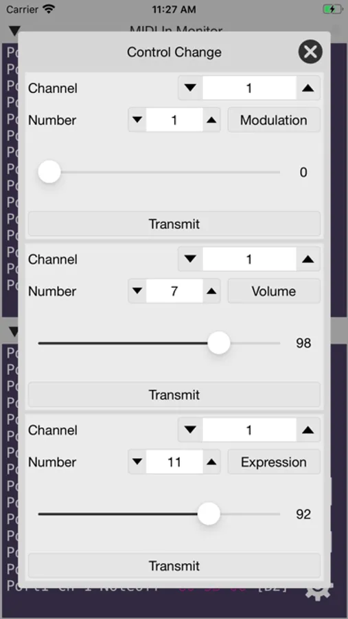 - Send note on/off, control change, program change data with exclusive views.