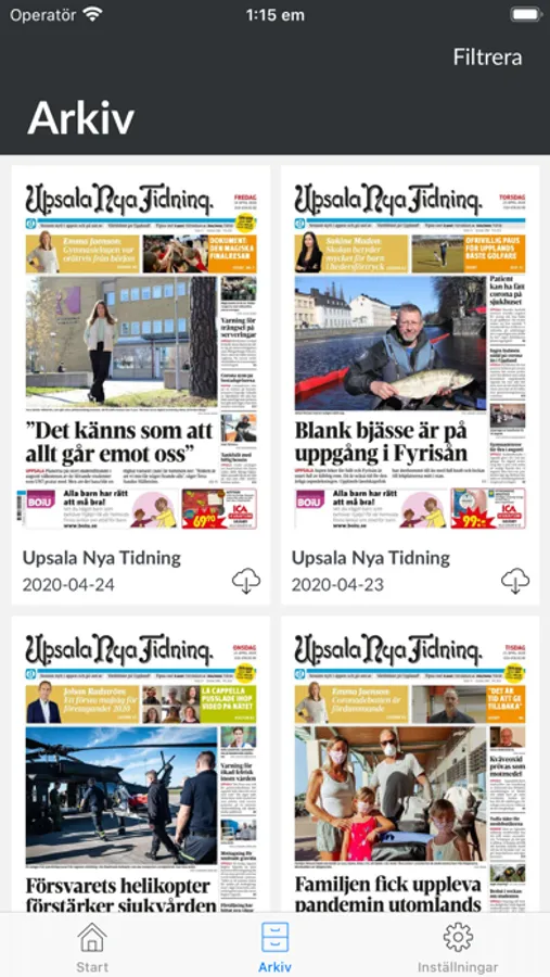 Välkommen till Upsala Nya Tidning. Med e-tidningen får du en digital version av dagens tidning. Du väljer mellan artikelläge eller att bläddra i tidningen. Lika enkelt hämtar du tidigare utgåvor i arkivet. Du kan också ladda ned e-tidningen och läsa den off line, när det passar dig. Med oss följer du alltid det lokala nyhetsflödet, sporten, familj, kultur, ekonomi, näringsliv och mycket mer!