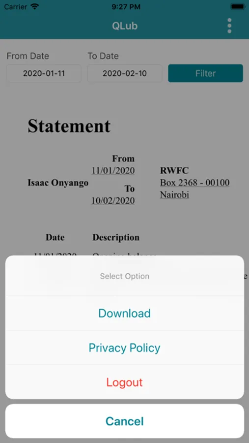 Qlub integrates with your Manager.io customer account allowing you to register and access your statements. It also allows you to specify date ranges and share the statements in PDF format.