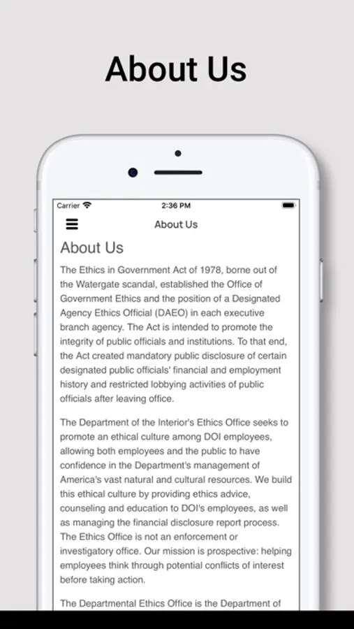 This interactive app provides up-to-date information on the Federal ethics rules and regulations that apply to DOI employees. The app contains easy-to-read summaries of the ethics laws regarding gifts, travel, outside employment and more, so you have a clear understanding of these rules, whether at home, work or on official travel. The app also gives you access to interactive videos, handy resources and a Forms and Reporting section so you can easily complete, save and submit DOI-related forms.