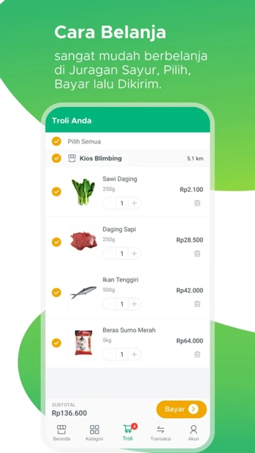 Juragan Sayur memberimu kemudahan dan rasa aman dalam memenuhi kebutuhan belanja harianmu tanpa perlu khawatir lagi resiko berjubelan dipasar.
