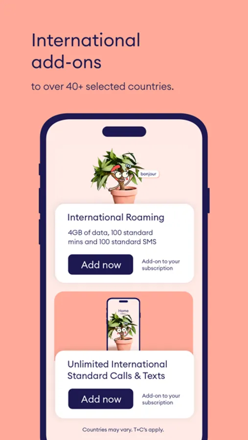 • Add International Roaming or Unlimited International Standard Calls & Texts