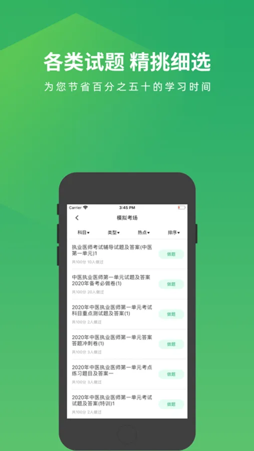 中医执业医师题库APP有模拟考场、历年真题练习、快速练习、考点练习、做题记录等多种学习与做题模式、丰富多样化的陪你一起考中医执业医师。