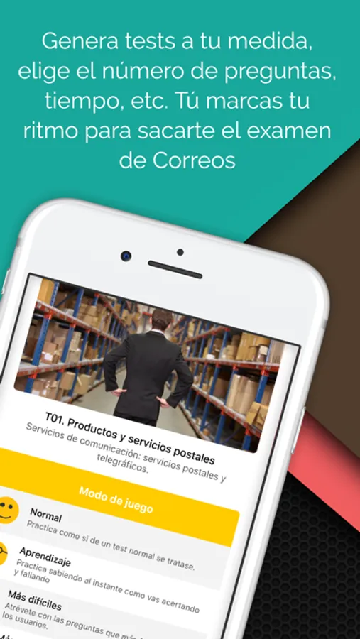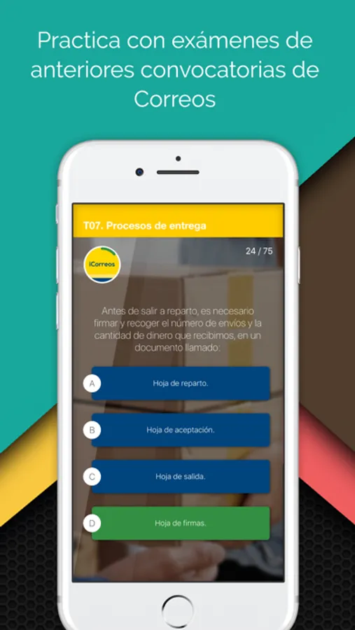 La app que te ayudará a preparar tu consolidación de empleo a Correos de una forma dinámica y sencilla. Podrás practicar lo que has estudiado en cualquier lugar y en cualquier momento.