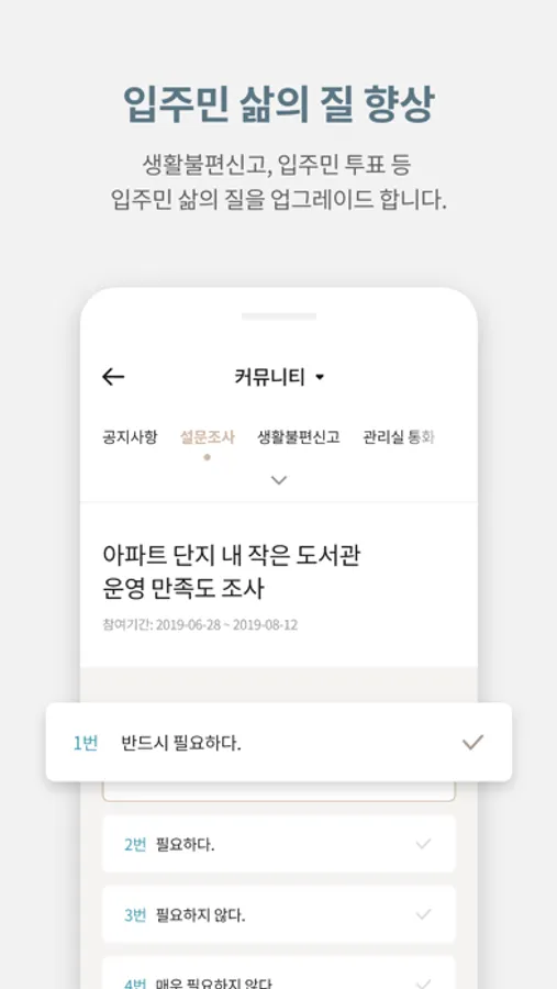 단지 공지사항, 생활불편신고, 입주민 투표, 단지 주변 생활 밀착 정보 안내 제공 들을 통해 입주민 삶의 질을 한단계 업그레이드 합니다.
