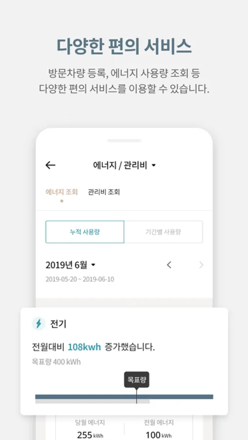 에너지 사용량 및 관리비 조회, 우리 단지 날씨 및 미세먼지 정보, 관리사무소 전화연결 등 다양한 편의서비스를 제공합니다.