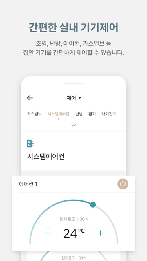 조명, 난방, 환기, 가스밸브 잠금, 대기전력 차단 등 세대내의 기기를 언제 어디서나 손쉽게 제어할 수 있습니다.