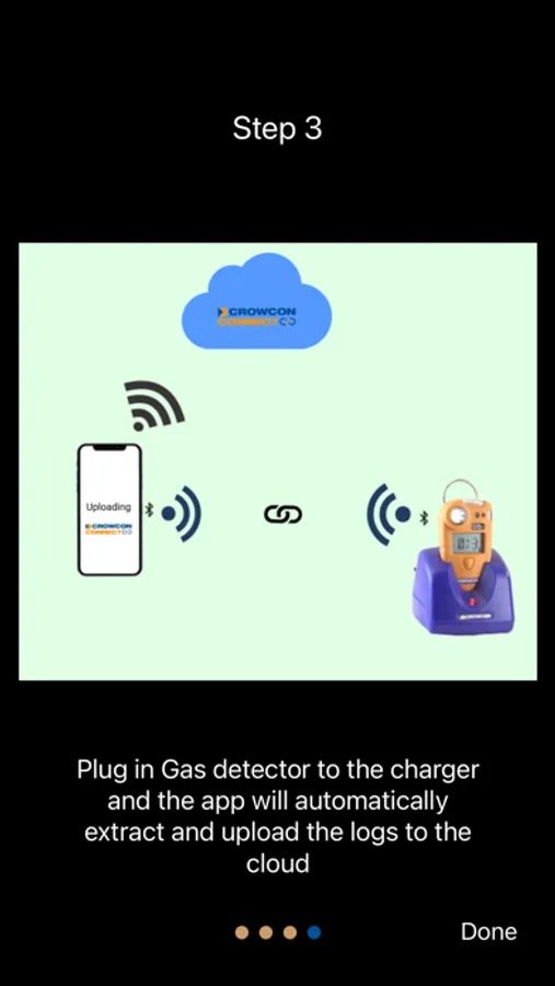 The app connects to the Crowcon manufactured gas detectors via BLE enabled chargers and extract logs from them and uploads to integrated digital solution.