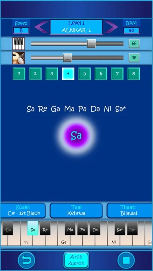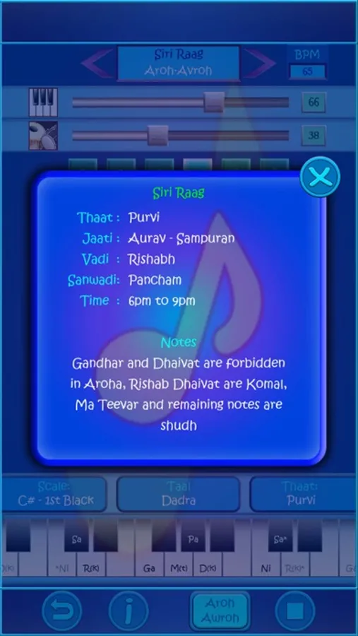 This is a music practice app. You can practice and improve your voice quality specially singing. There different patterns of music notes to sing with. these patterns are known as 'ALNKARS' in Indian classical music.There is a section called EAR TRAINING where you can train your listening to the music notes and patterns.You can practice with different Taalas (Rhythms) Like: Kehrwa ( 8 Beat ), Dadra (6 Beats), Roopak ( 7 Beats ), Deepchandi (14 Beats), Jhapp (10 Beats ) and Teentaal (16 Beats ) etc. At present we have 4 Alankaars and One Taal (Kewra ) to practice, But Soon we will add More ALANKAARS, More Taals and Raaga based patterns.