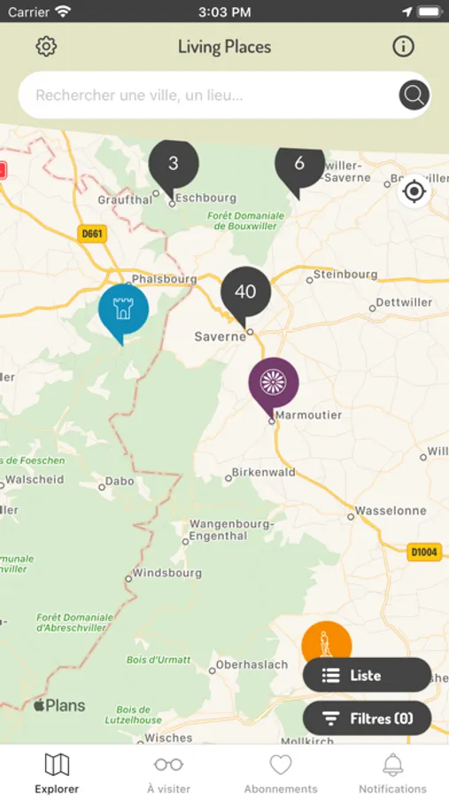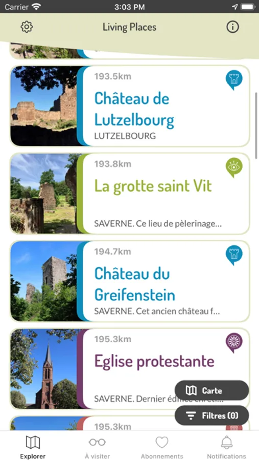 3. Etre alerté des lieux à visiter autour de vous. Avec Living Places vous pouvez à tout moment faire apparaître la liste de toutes les oeuvres référencées dans l’appli se trouvant autour de vous, des plus proches aux plus éloignées de l’endroit où vous vous trouvez.