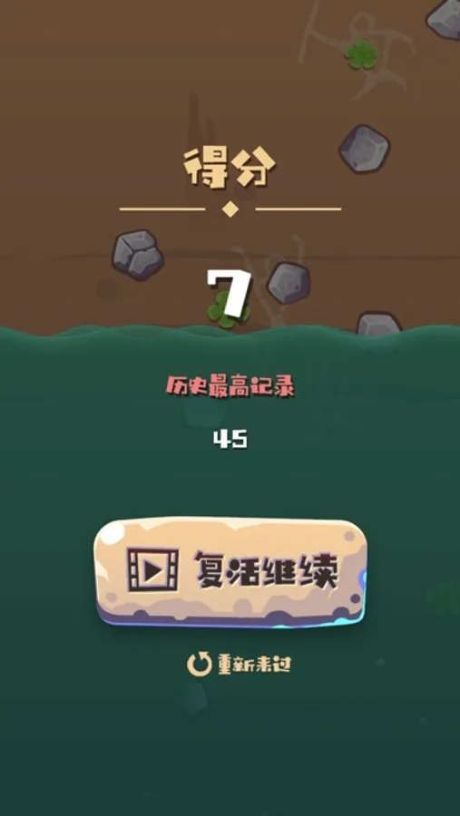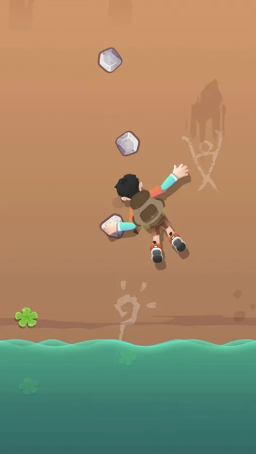 这是一个惊险刺激的绝壁攀岩小游戏,手接近上方石头时,看准时机触屏,就可以使角色抓住新的石头,如果点击时游戏角色的手距离石头不够近,角色会掉下悬崖,游戏失败。