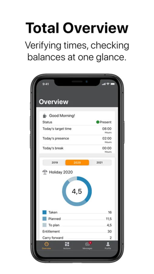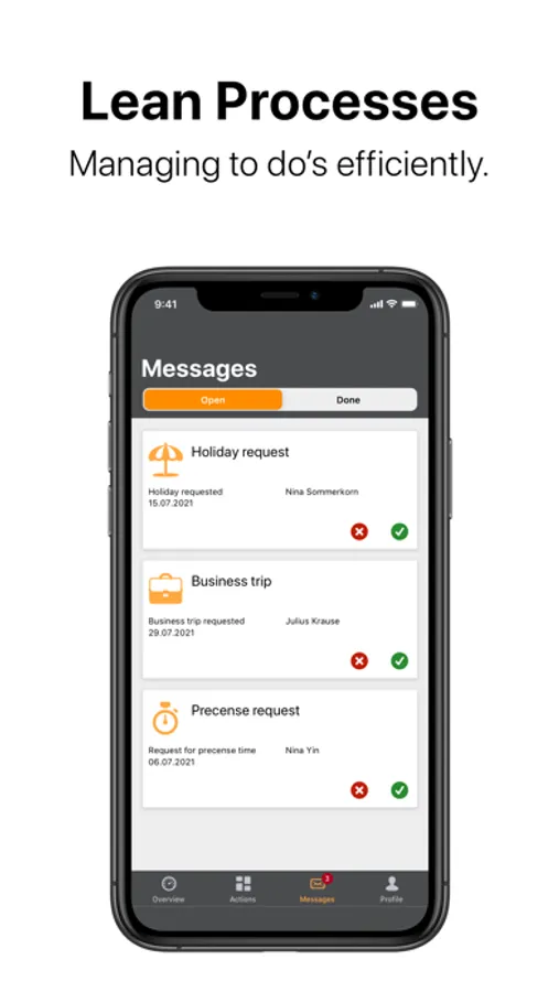 - Automatic and proactive notification for employees in case of missing sick notes or clock- out times. Lean processes guaranteed.