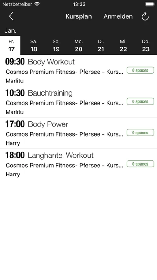 Direkter und aktueller Zugriff auf den Kursplan von überall: Für jeden Kurs kannst Du Details wie Zeit, Kursbeschreibung, Raum und Merkmale wie z.B. den Schwierigkeitsgrad einsehen.