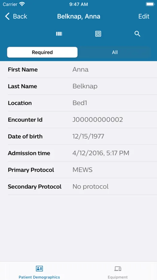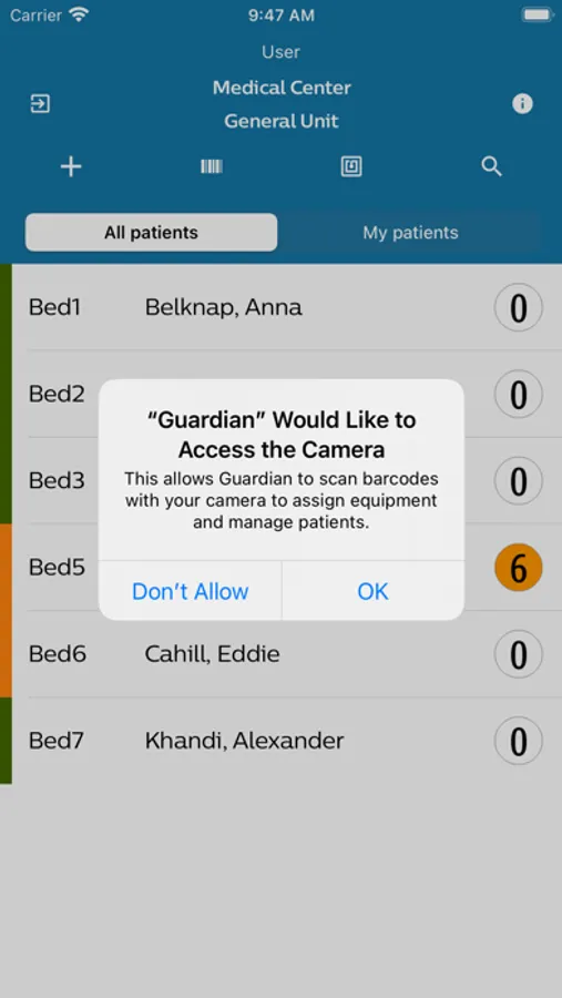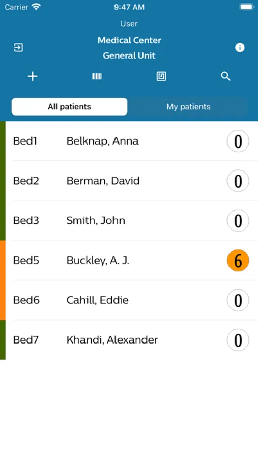 Similar to the IGS desktop client, the Guardian app displays the patient details, including their caregiver, bed, name, and EWS score. You can edit these details directly with the Guardian app.