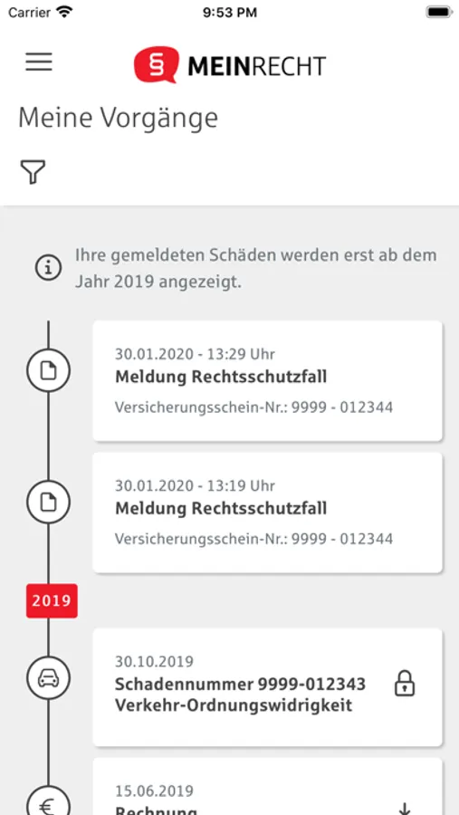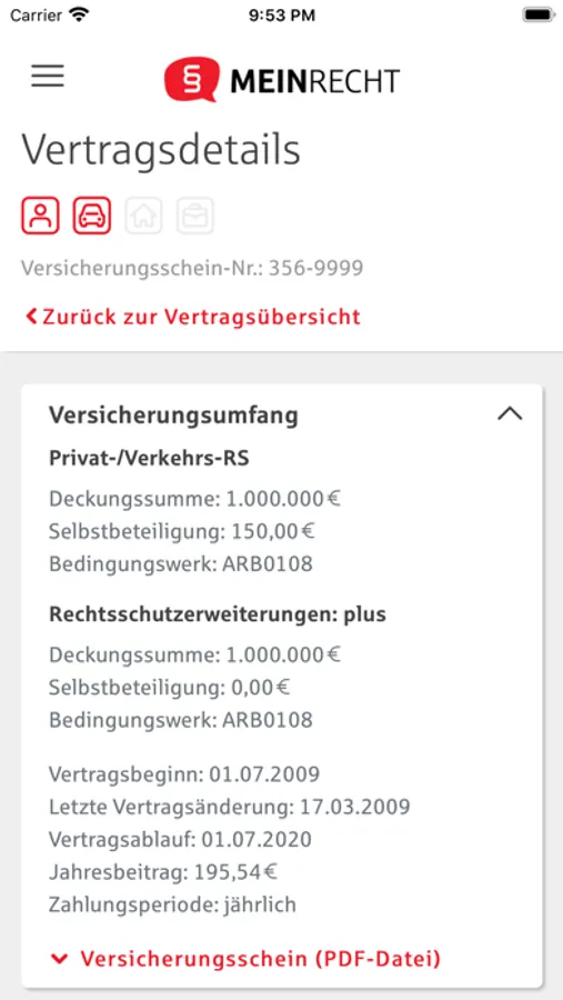 Sie möchten sich einen Überblick über Ihren Rechtsschutzvertrag, Ihre Rechnungen oder Ihren Schadenverlauf verschaffen? Mit der MEINRECHT-App haben Sie alle Informationen stets griffbereit und wichtige Dokument als PDF-Download immer im Zugriff.