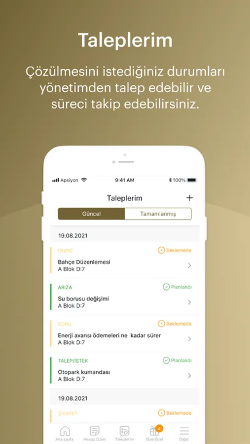 • İş Talebi ve Takibi: Örneğin, musluğunuz bozuldu. Bunun için iş talebi açıp ardından takibini de gerçekleştirebilirsiniz.