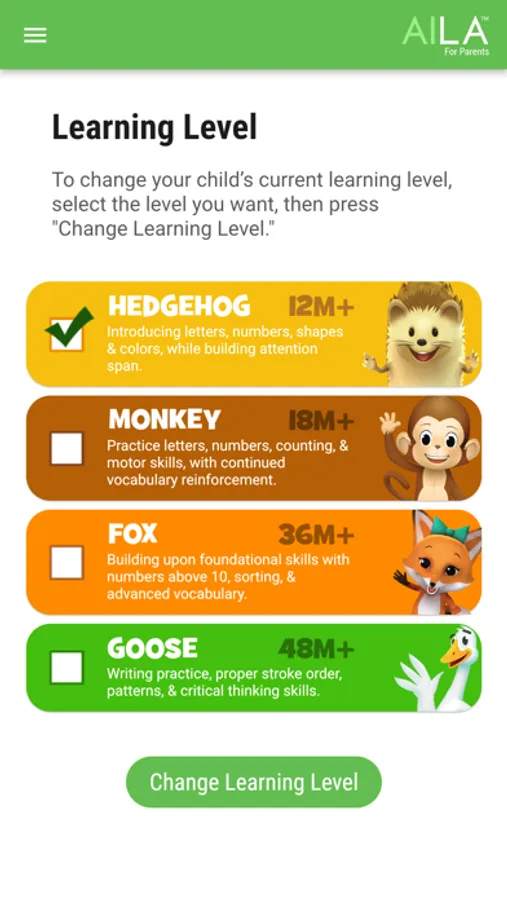 Set your child’s learning level, start and stop learning sessions, rate and review learning sessions, and monitor screen time.