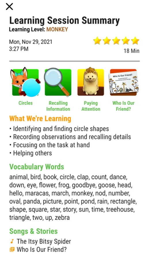 Review the curriculum, stories, songs, and vocabulary are covered in each of your child’s Learning Sessions, and track your child’s progress on their Learning Journey.