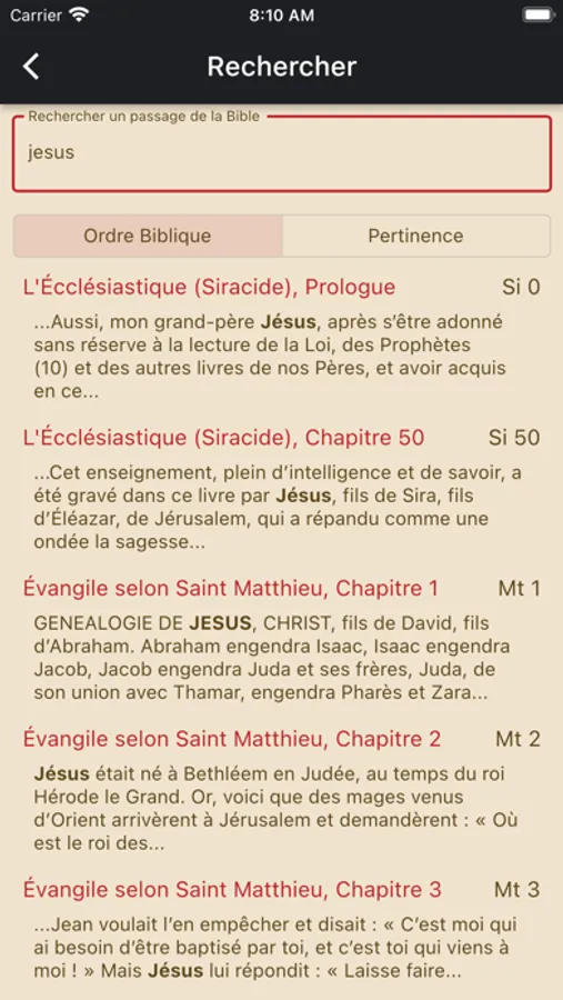 - Trouver une Parole dans la Bible grâce à la fonction recherche.