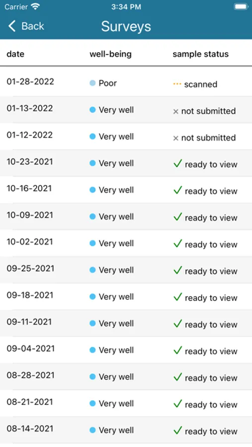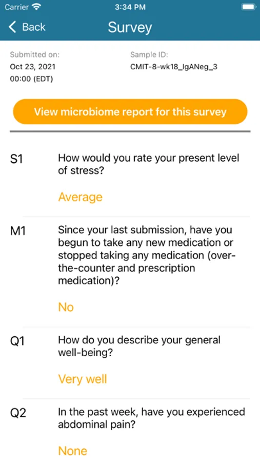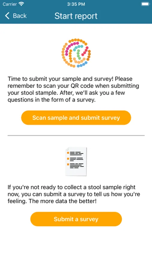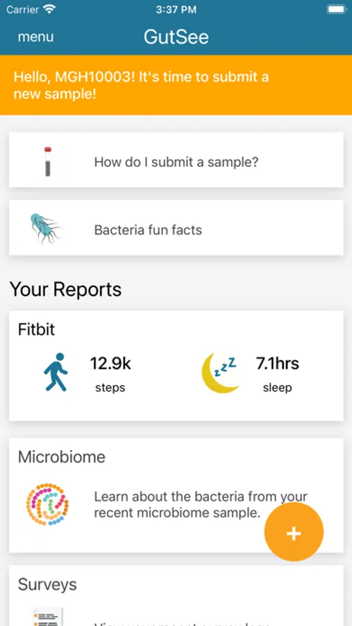 Users of this app are participants of a clinical trial. Login details will be provided to participants by their clinical coordinator. This mobile application is integral to the study as a means of data collection. Using this app, participants will complete questionnaires about their health and wellness. After completing the questionnaire, users can also scan a QR code for the sample they plan to submit. Users will be able to view a history of all their reports . Through this app, users can also go to the ASA24 website (completely separate) to log dietary information.
