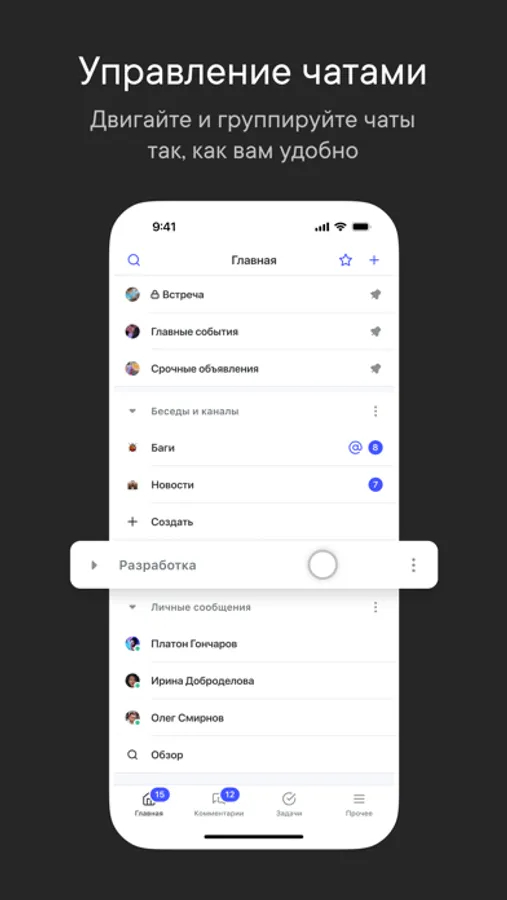 Двигайте и группируйте чаты, как вам удобно в компактном меню, используя папки для чатов и закрепленные чаты.