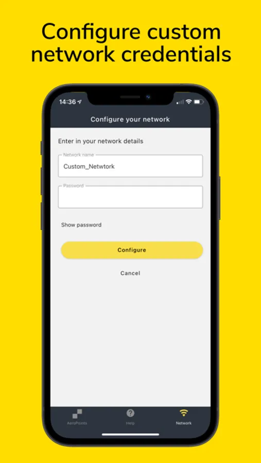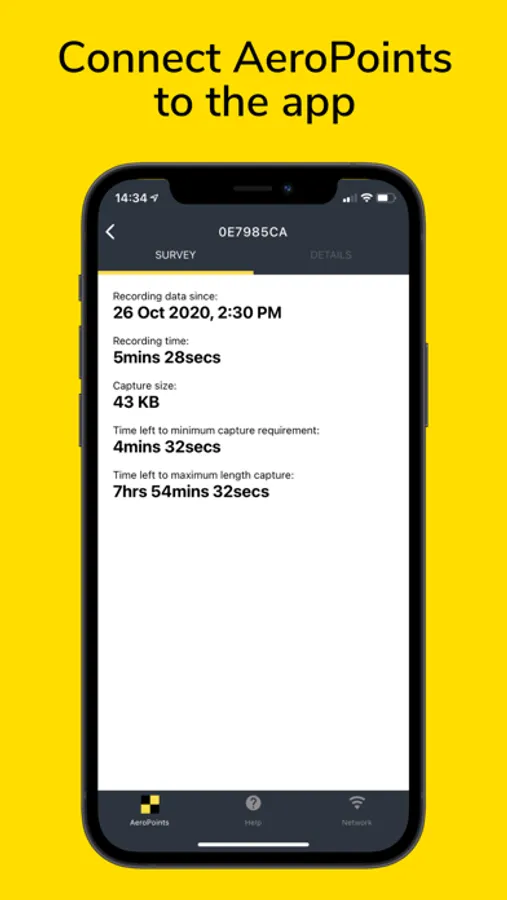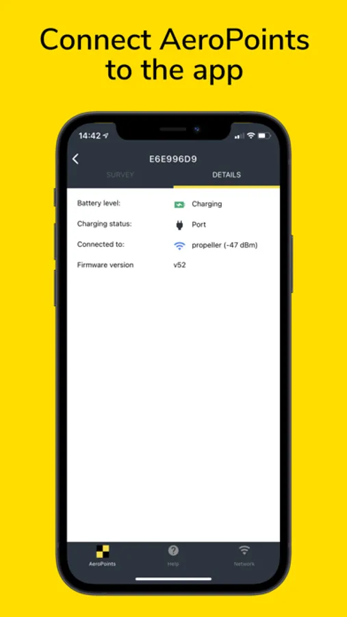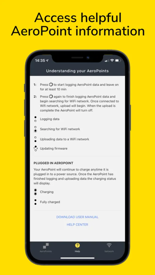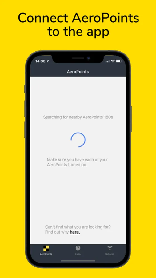 The AeroPoints app is a companion to our latest generation AeroPoint 2 devices. Use this application to connect to your AeroPoints, view upload information, and configure custom network credentials. We’ve also included a help button at the bottom so you can learn more about AeroPoint 2s.