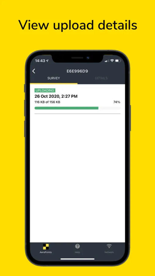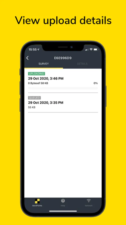 If you use the app to connect with AeroPoint 2s during a data upload, you can follow along with the progress. When an AeroPoint uploads data, the Survey view will list the surveys being uploaded or queued for upload in chronological order. You’ll see a progress bar and then a check mark to confirm a successful upload.