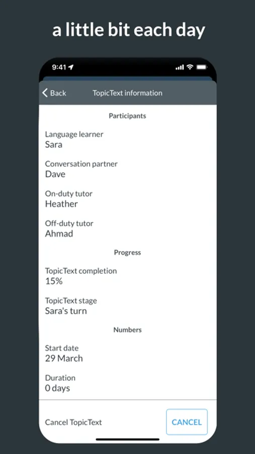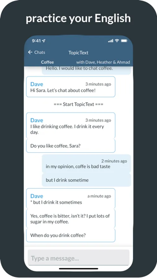 Chatloop is a messaging app that connects you to a conversation partner in a chat room. Together, you'll do one of our communication practice activities. You'll only send a few messages each day, at a time convenient to you, so each activity lasts for about a week or so. When you finish one activity, we'll connect you to another partner for another activity. That way, you get a regular drip feed of authentic English practice.